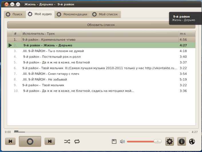 VkPlayer - удобный плеер для музыки из Вконтакте. Плеер, который позволяет прослушивать музыку в он-лайне, не загружая браузер. Что бы установить VkPlayer в Ubuntu, нужно добавить ppa автора, обновить пакеты и установить саму программу: