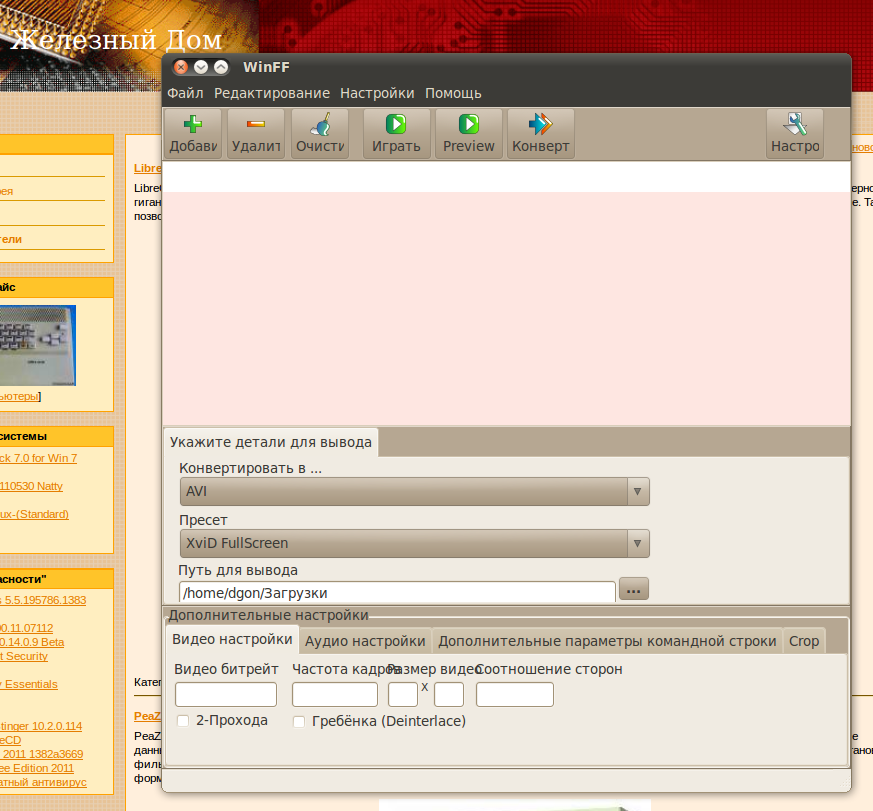 Если видео не конвертируется и ffmpeg «ругается» на отсуствующие кодеки, то можно поставить их из репозитария Medibuntu, как это уже описывал сегодня для воспроизведения звука с кодеком amr. Повторюсь: