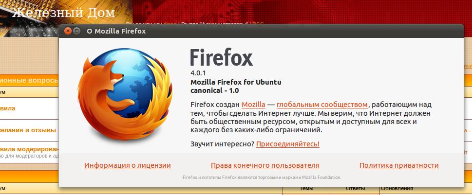 Обновление Firefox до 4 версии в Ubuntu 10.10 Открываем терминал и добавляем команду sudo add-apt-repository ppa:mozillateam/firefox-stable тоесть добавляем репозиторий. После успешного завершения процедуры добавления репозитория, обновляемся командой sudo apt-get update и sudo apt-get upgrade . На этом все, обновление успешно. Запускаем обновленный Firefox4 любуемся проделанной работой и наслаждаемся.