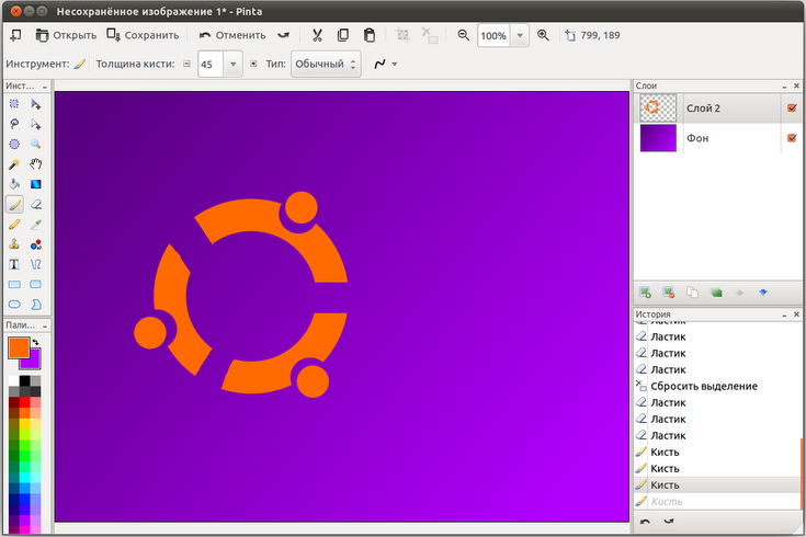 Paint для Ubuntu Версия растрового графического редактора Pinta, — своеобразного Paint для Ubuntu. “Пинта” может работать со слоями, добавлять эффекты, корректировать цветовую гамму… А еще она на русском языке. Установить