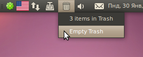 Корзина в трее Trashindicator отображает сколько файлов в корзине, а так же позволяет с помощью одного клика очистить корзину. Скачать deb пакет с официальной страницы проекта -=Тут=-