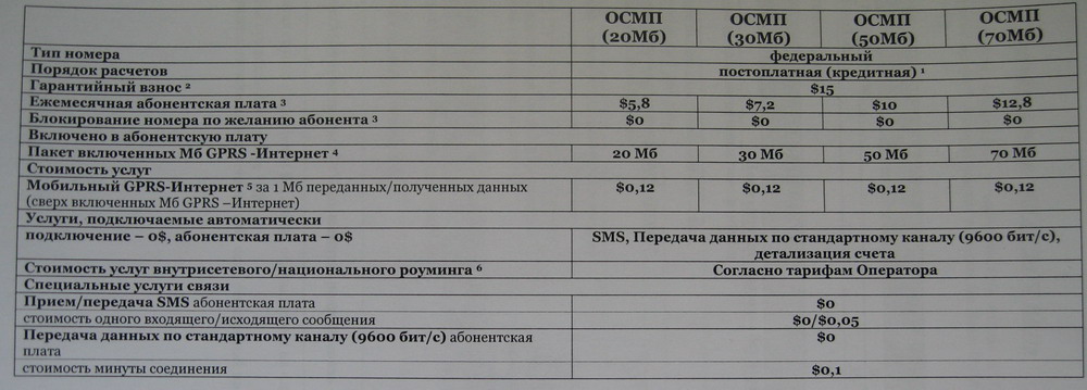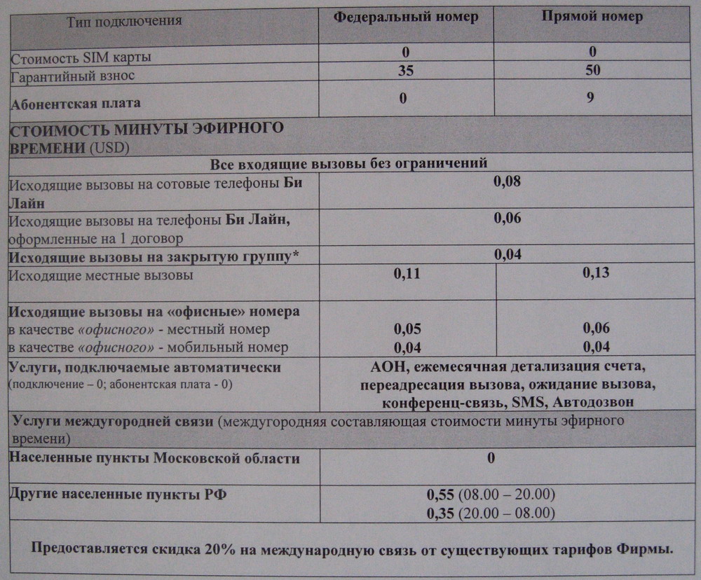 Выношу на рассмотрение и обсуждение (НЕ РЕКЛАМА): ПРАЙС-ЛИСТ для корпоративных клиентов «Билайн» всех регионов Тарифный план не предусматривает возможность совершения голосовых вызовов, предоставляется только передача данных. 1. За оказанные услуги Оператор ежемесячно (по истечении расчетного периода) выставляет Абоненту счета в соответствии с действующими тарифами Оператора. Счет должен быть оплачен Абонентом в течение 25 дней после его выставления. 2. Гарантийный взнос взимается единовременно с каждого телефонного номера, который подключается к Тарифному плану. 3. Взимается по окончании расчетного периода (месяц). При наличии в течение расчетного периода блокировок телефона по желанию абонента или инициативе Оператора - рассчитывается посуточно. В случае блокирования телефона по причине несвоевременной оплаты счета - взимается в полном объеме. 4. Округление переданных/полученных данных производится с точностью до 0.01 Мб в соответствии с арифметическими правилами округления 1 раз в 15 минут либо при достижении суммы переданных и принятых данных 500 кб, а также при завершении GPRS-сессии. 5. Нетарифицируемый объем и переданных и полученных данных — 5 кб. Округление осуществляется в большую сторону с точность до 85,33 кб 1 раз в 15 минут либо при достижении суммы переданных и принятых данных 500 кб, а также при завершении GPRS-сессии. 6. Услуги внутрисетевого и национального роуминга, при кредитном порядке расчетов, предоставляются автоматически. Оплата производится в рублях по внутреннему курсу Компании – 28,7 рублей за 1 (один) доллар (США). Цены и тарифы указаны в долл. США без учета НДС.