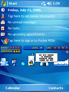 Вот есть что-то похожее на правду.... Pocket Penguin v1.0 Из жизни продвинутого пингвина:-) совместима с Pocket PC: ARM процессор и выше Windows Mobile 2003 (Pocket PC 2003, Windows CE 4.20) и выше Pocket Penguin — это симулятор жизни пингвина на экране Today. Он любит покушать, поспать, смотреть TV, играть с мячом и общаться с друзьями по телефону и, конечно же, необходимость вашего внимания к нему не на последнем месте в его списке. Забираем здесь