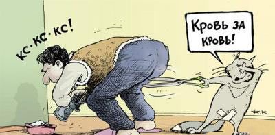 Однажды вечерком пятеро молодых и жизнерадостных собрались у одного из них дома. Спокойная обстановка, дружеское взаимопонимание, разговоры о своем, мужчинском, покер, разнообразные спиртные напитки. Хозяин преуспел в последнем, и его так аккуратно, по-дружески, отнесли в спальню и уложили в собственную кровать. Доставая очередной продукт из холодильника, кем-то была обнаружена куринная шея. Почему-то она вызвала прилив веселья и потребность что-нибудь с ней сделать. Желая доставить несколько приятных минут после пробуждения хозяину дома, ребятки расстегнули молнию джинсов спящего, вставили куринную шею и плотненько застегнули опять, чтобы шея удержалась до утра. Тут неожиданно пришла подружка хозяина. Ей объяснили, куда нужно пройти, чтоб увидеть тело друга. Девушка направилась в комнату, а игроки замерли в радостном ожидании - появился новый человек, который по достоинству оценит милую шутку. Реакция оказалась неожиданной - раздался пронзительный визг на высокой ноте, и через секунду к нему присоединился мужской ор ужаса. Четверо смелых ворвались в комнату и увидели.... хозяйскую кошку, грызущую хозяйский чл... грызущую куринную шею. Как рассказывал пострадавший, проснувшись от женского крика, он приподнял голову и увидел сидящую на нем кошку, подло оскверняющую все его достоинства. Несмотря на страшный шум, животное торопилось съесть побольше, пока не отобрали. Очевидец и участник, рассказавший мне эту историю больше всего почему то переживал, что под рукой не оказалось фотоаппарата.
