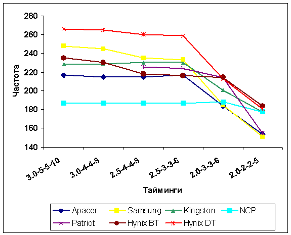 Первое место с довольно большим отрывом занимают модули Hynix на чипах HY5DU56822DT, почетное второе место - модули Samsung. Далее плотной группой финишируют сразу несколько участников: Kingston, Hynix на чипах HY5DU12822BT, Patriot, Apacer и с огромным отставанием последнее место занимают модули производства NCP.